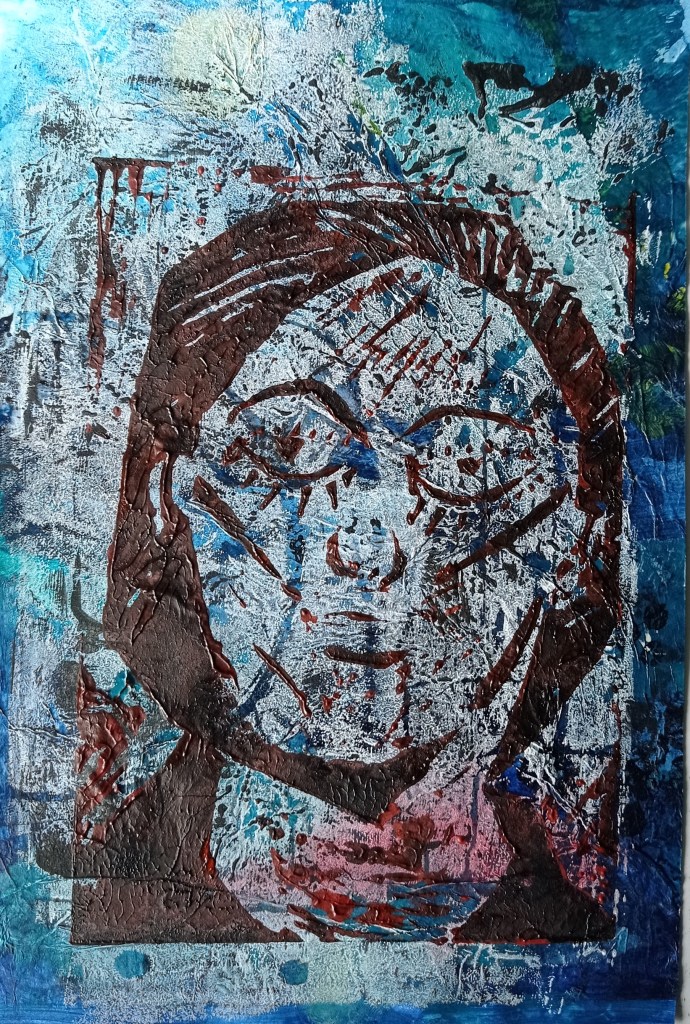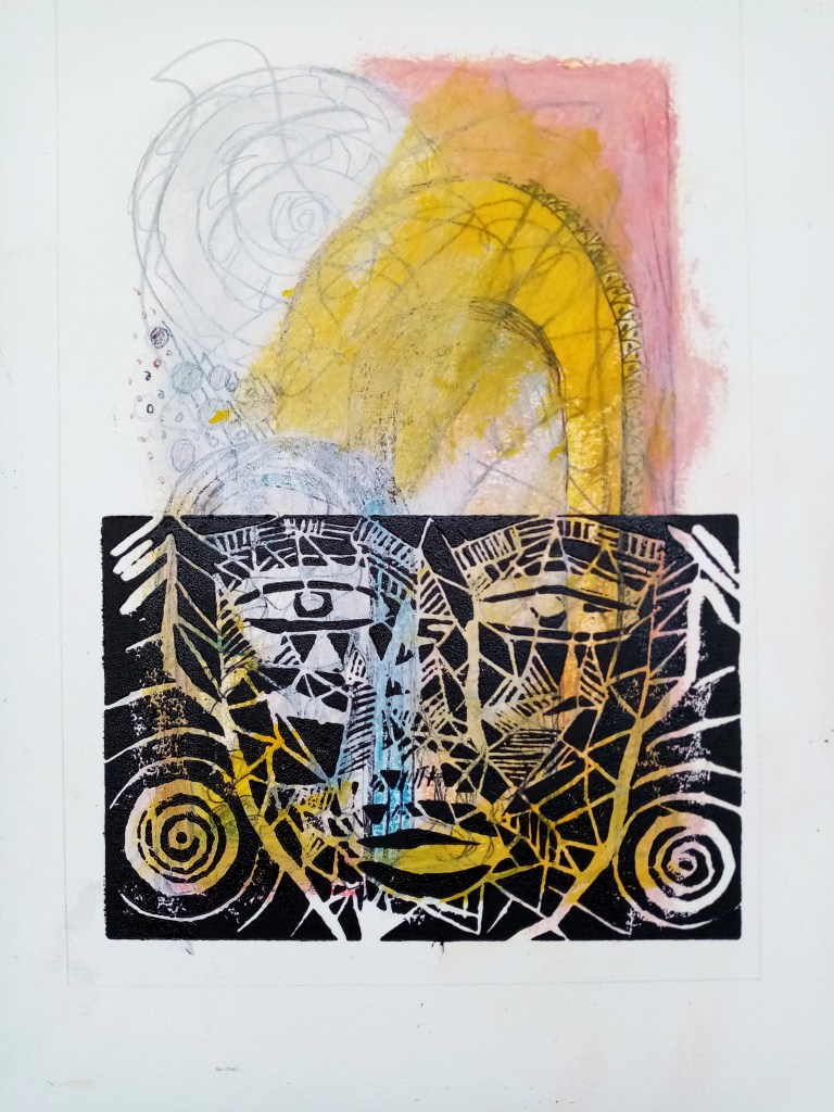 I’m having fun playing with the idea of combining monoprints and lino prints in collaboration with David who is a proper lino printer by which I mean that, unlike me, he can carve out a lino block without shedding blood and does not walk around with hands covered in sticking plasters. So he does the carving and I make the monoprints which do not involve sharp pointy things.